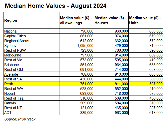 尽管经济繁荣,珀斯的房价仍然相对“可承受”,8 月份的中位价为 751,000 澳元,而首府城市综合价格为 861,000 澳元: