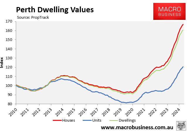 根据 PropTrack 的数据,珀斯的房地产市场经历了巨大的繁荣,自 2020 年 3 月大流行开始以来上涨了 76%: