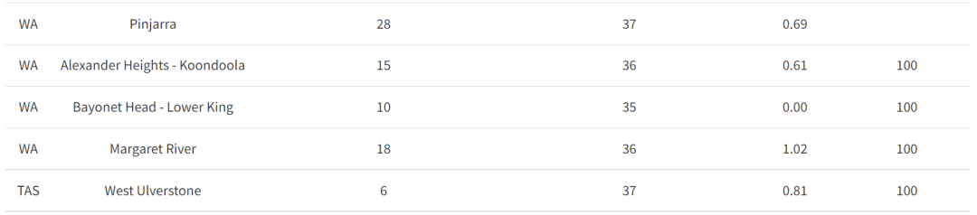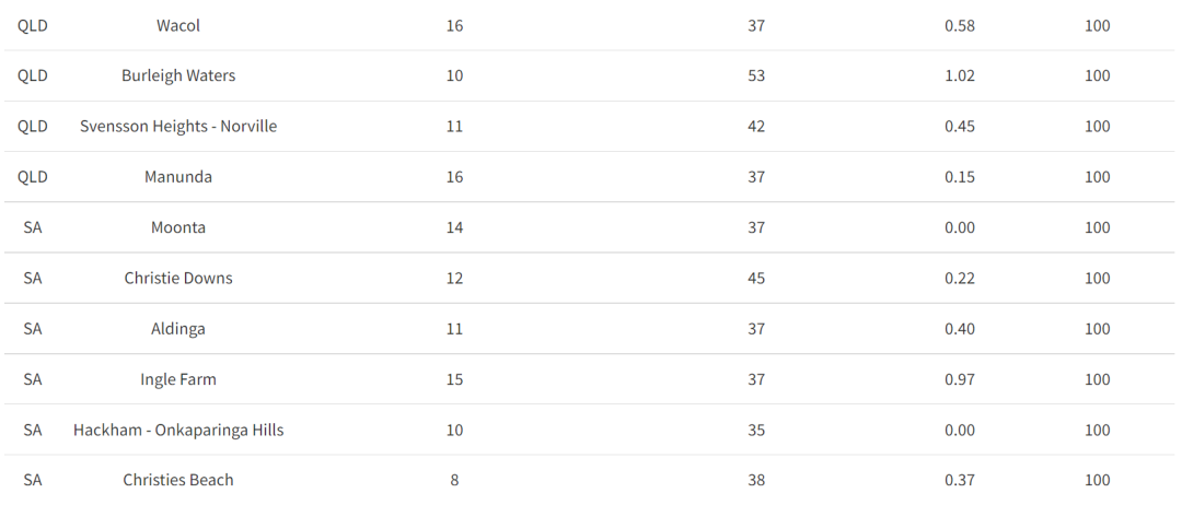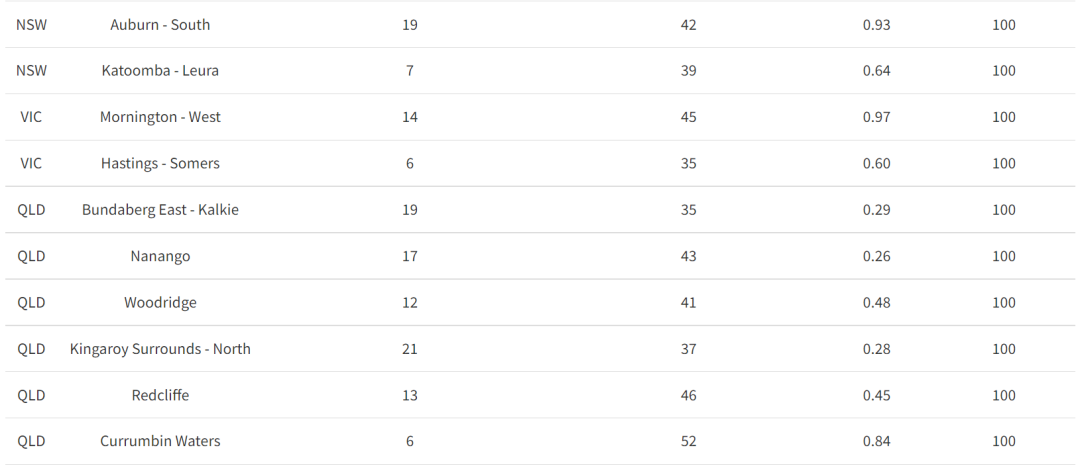 我们可以看到,在租金上涨和低于 1% 的低空置率的情况下,澳大利亚数十个郊区得分高达 100 分,其中新州 12 个、维州 2 个、昆州 10 个、南澳 6 个、西澳 4 个和塔州 1 个。