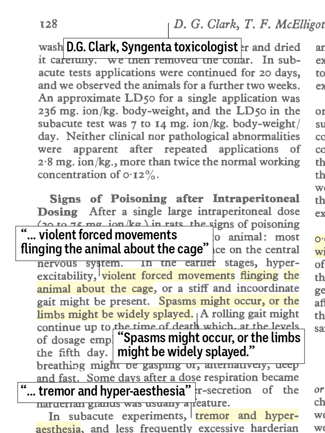 (1996年先正达公司任职科学家发现注射百草枯的老鼠会出现痉挛、震颤和“剧烈的强迫运动。)