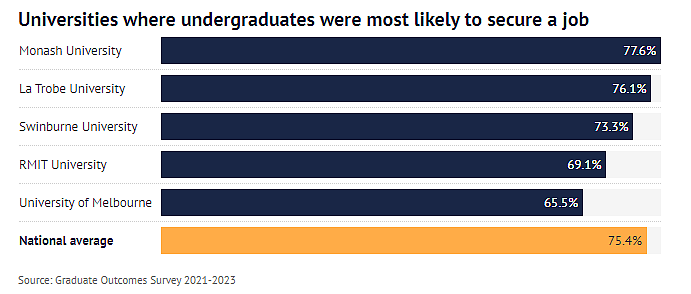 此外,在维州的各所大学中,调查数据显示,2021年至2023年间,莫纳什大学(Monash University)的本科毕业生获得全职就业的比例最高,达到77.6%。