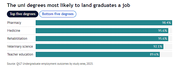 维多利亚大学的情况也类似,该校一位发言人表示,护理和相关健康领域的毕业生在就业能力排名中始终名列前茅,教学和教育毕业生也表现不俗。