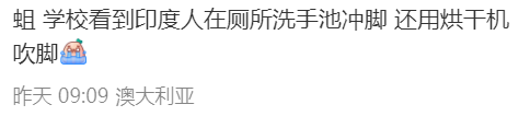 “学校看到印度人在厕所洗手池冲脚,还用烘干机吹脚。”