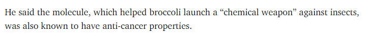 研究人员指出,这种分子帮助西兰花“发射”的这种对抗昆虫的“化学武器”异硫氰酸盐,不仅能降低血栓的风险,同时也被认为具有抗癌特性。