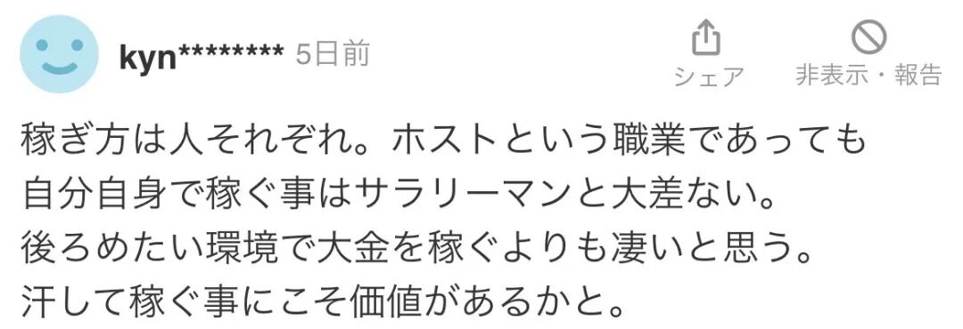每个人的赚钱方式不同。即使是做牛郎,自己赚钱和上班族也没什么两样。我觉得在不太光彩的环境下还能赚到大钱更厉害。汗水换来的钱才有真正的价值。