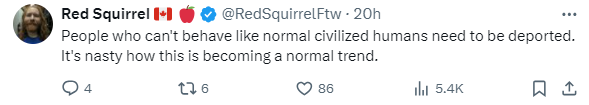 “行为举止不能像正常人一样的人们应该被驱逐出境,(当众拉屎)正在成为一种正常的趋势,令人厌恶。”