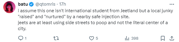 “我猜这次跟(印度)留学生无关了,而是由附近一个安全注射点培养的瘾君子,(印度)留学生会在小街道上大便,而不会在城市的中心地段这样做。”