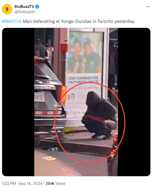 9月14日,有网友在社交媒体X上发帖称,在多伦多Eaton Centre外的繁忙街道上,有一名男子当众脱下裤子,蹲下拉屎!