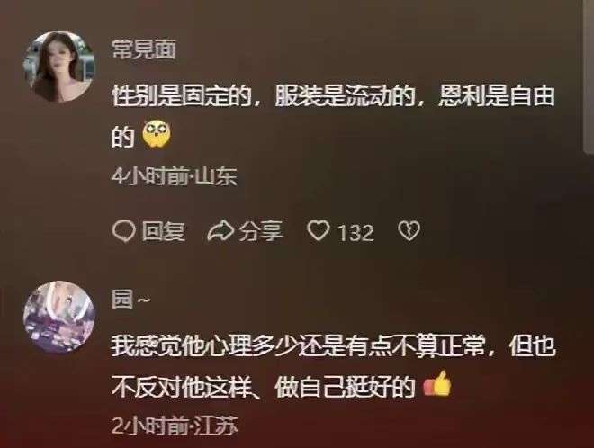 对此有网友评论道:性别是固定的,服装是流动的, 恩利是自由的。