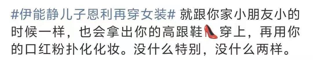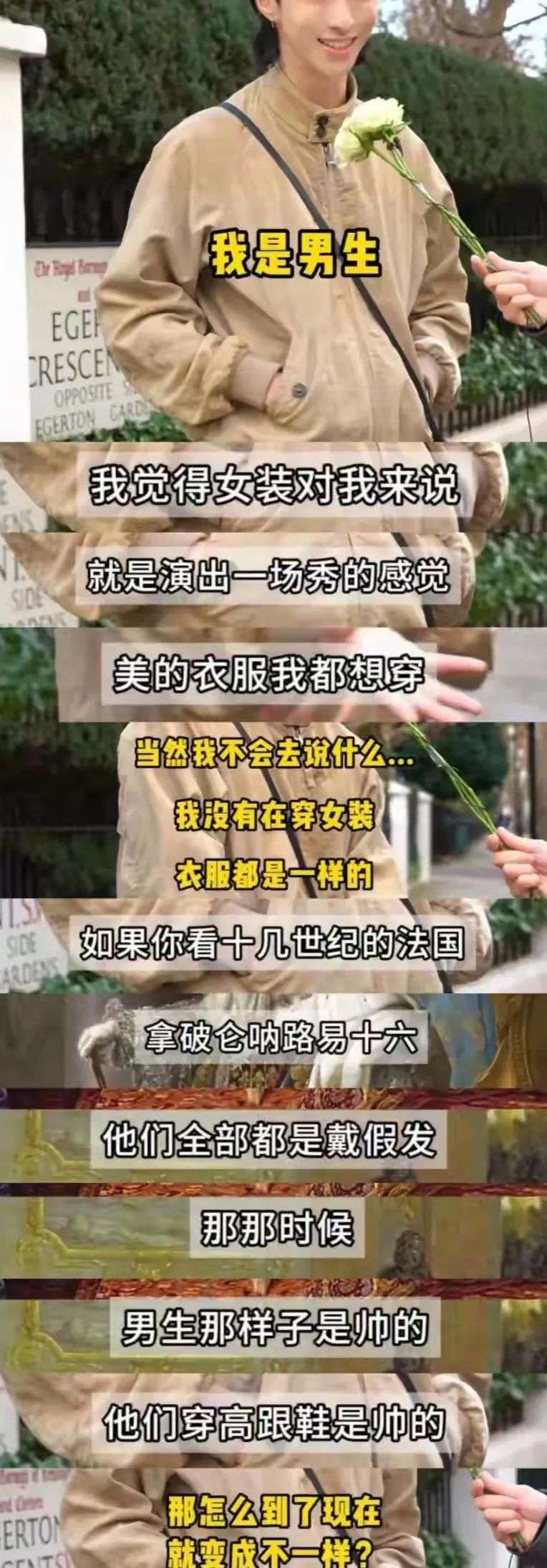 其实,恩利也曾回应过对女装的看法,他表示自己平时都是穿男装的,而女装对于自己来说,更像是演出一场秀。更是直白地表示自己并不会去说什么男生女生都一样,而正是性别是先天的赐予,那么剩下的便是社会的赐予了。