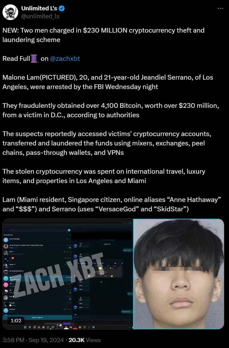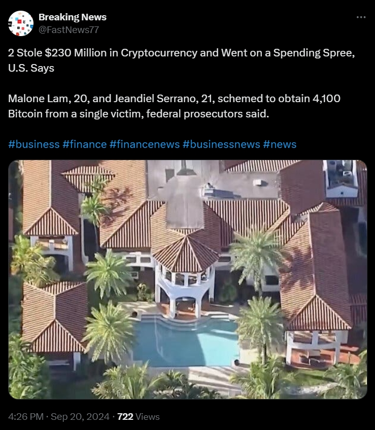 据悉,这两名男子被控串谋诈骗华盛顿特区的一名民众,窃取4100枚比特币,市值超过2.3亿美元。被捕前,两人曾在洛杉矶和迈阿密大肆挥霍,购买豪车豪宅等。