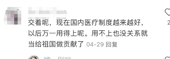“现在国内医疗制度越来越好,以后万一用得上呢,用不上也没关系,就当给祖国做贡献了。