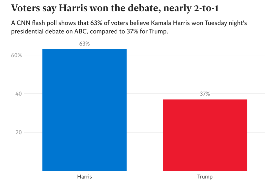 辩论结束后,根据CNN在当天发布的民意调查,63%观看节目的登记选民认为哈里斯赢得了辩论,37%的选民认为特朗普赢了。