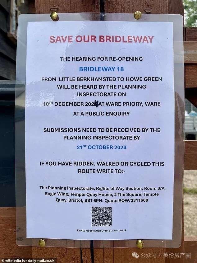 她表示:2019 年,我们度假回来时注意到,树篱中原本有一个写着‘Bridleway 18’的标志,但这个标志被移除了。后来,我们看到一个写着“私人财产”的牌子。2020年1月,他们锁上了马道的大门。我们再也无法从房子前面走到后花园了。我们必须穿过房子。