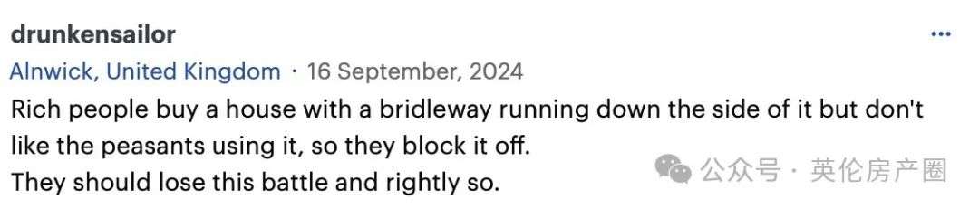 对此,网友们表示:有钱的人买了一幢房子,房子边上有一条马道,但他们不喜欢农民使用它,所以他们把它封了。他们应该输掉这场战斗,这是理所当然的。