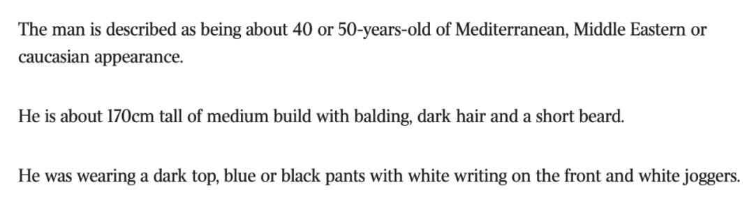 据悉,这位男子被形容为中东或者白人长相。