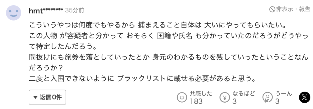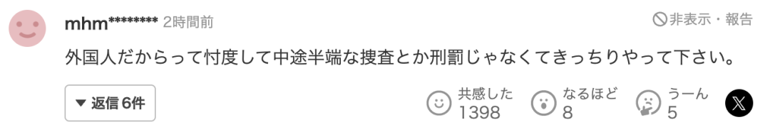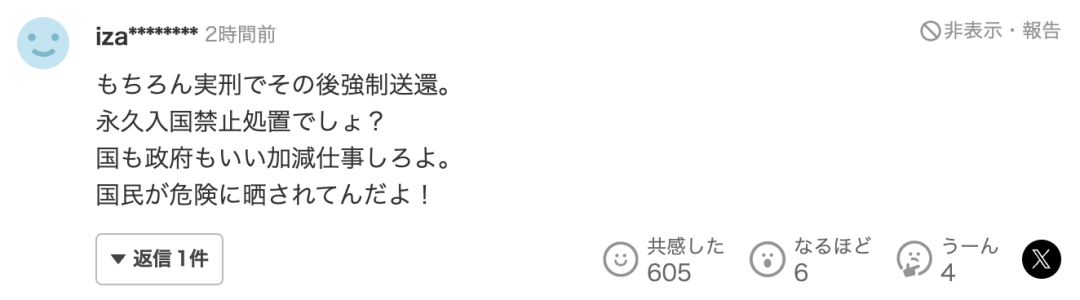 “当然,被判实刑之后会被强制遣返。是永久禁止入境的措施吧?国家和政府都好好工作吧。国民被置于危险之中!”