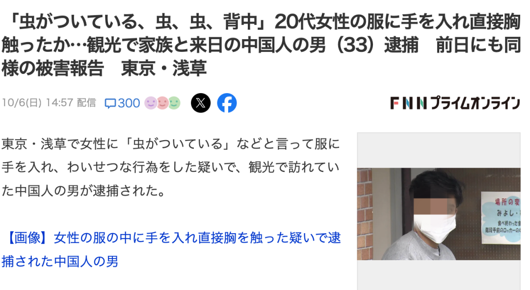 收藏33岁中国男子来日本旅游,昨天刚到机场就被捕!竟是因4个月前在浅草猥亵女生…