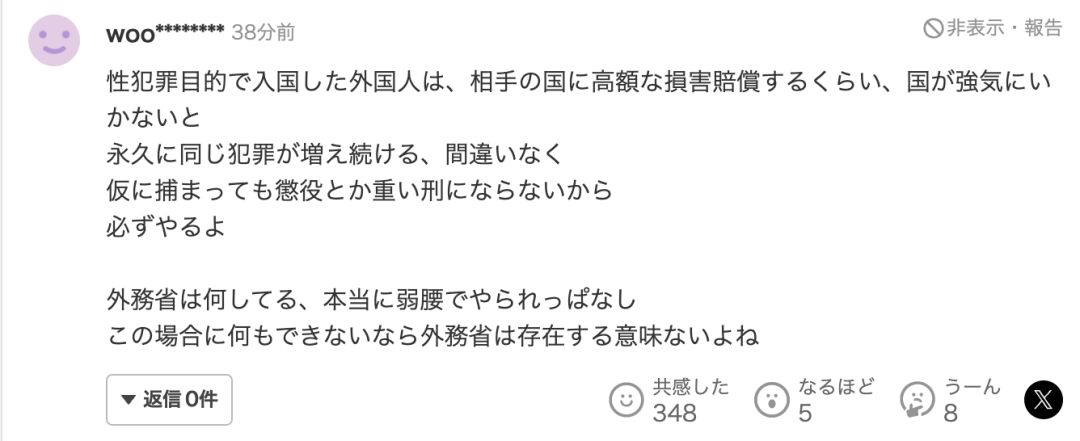 “如果外国人以性犯罪为目的进入日本,那对方的国家必须足够强大,能够向日本支付大量赔偿。毫无疑问,同样的犯罪行为将会永远不断增加。即使被抓到,也不会被判入狱,也不会受到重刑。外交部到底在做什么?真是软弱无力,一直放任自流。如果在这种情况下无能为力,外交部就没有存在的意义了。”