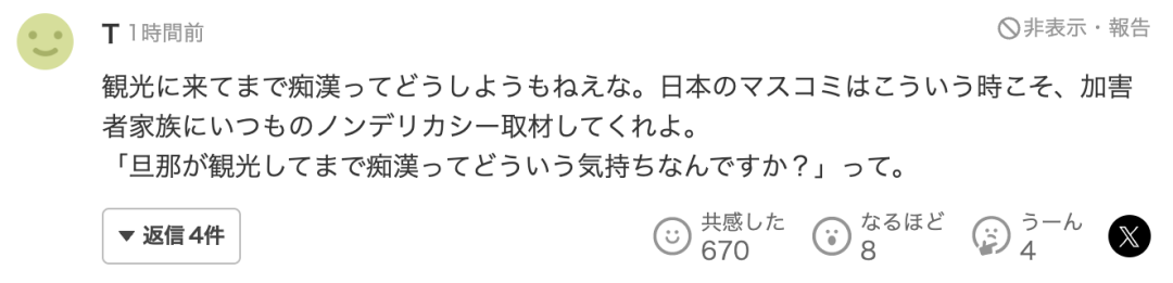 “来观光的却成了痴汉,真拿他们没办法。日本媒体越是这种时候,就越应该像往常一样对加害者家属不用顾忌的采访。丈夫来观光却成痴汉,是什么心情?”