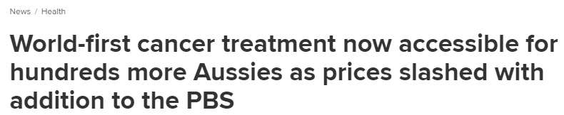 因此不难想象,即使Imbruvica和Venetoclax被研发,如果没有纳入PBS,又有多少人能负担得起每月12,600澳元的费用。本次将这两款救命药纳入PBS,不仅是救了患者们的命,也是给患者们吃了一颗定心丸,真正把澳洲医疗福利最大化!