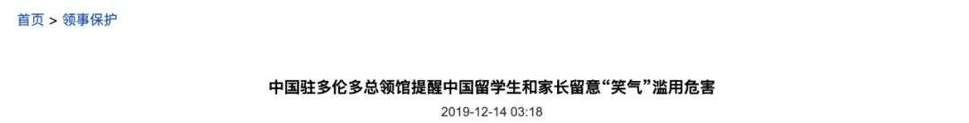关于吸食笑气的危害,实际上早在2019年我国驻多伦多总领馆就曾专门发文,提醒过中国留学生和家长都要留意“笑气”滥用的危害。