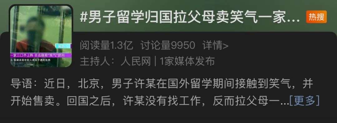 此前人民网就报道过一起#男子留学归国拉父母卖笑气一家获刑#真的离谱的事件。