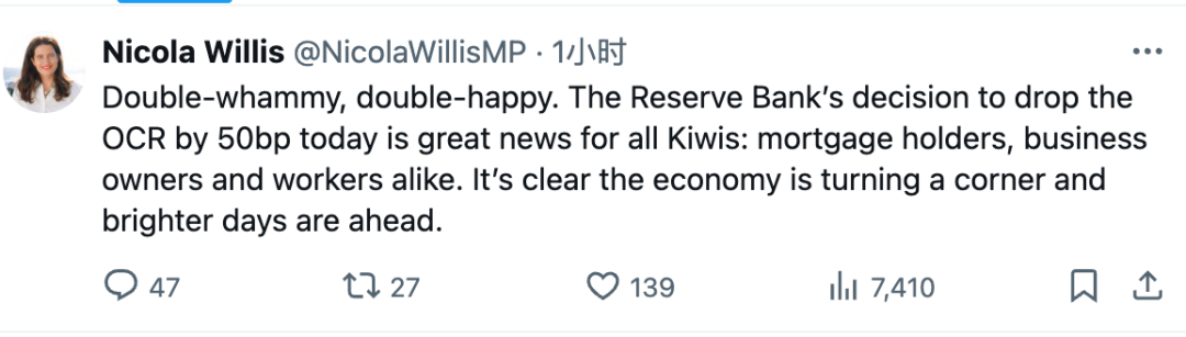 对于降息的喜讯,政府乐见,新西兰财长Nicola Willis下午表示: