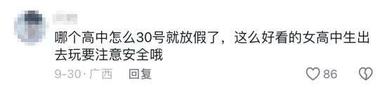 “哪个高中怎么30号就放假了,这么好看的女高中生出去玩要注意安全哦。”