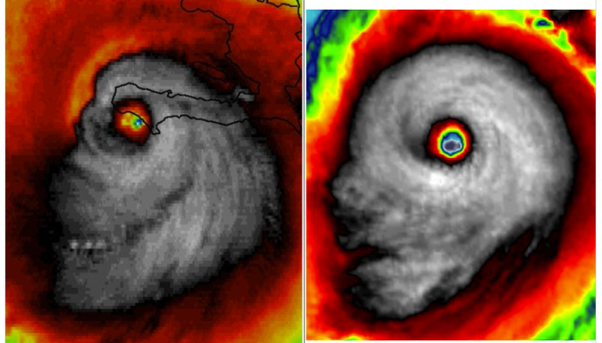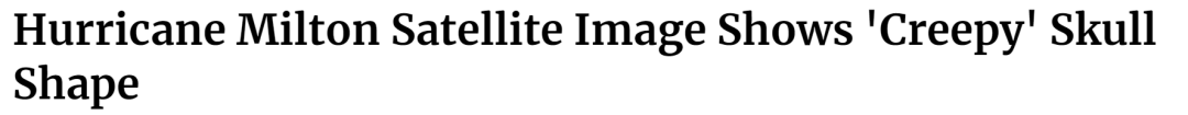 作为佛州千年难得一遇的世纪飓风,“米尔顿”来势汹汹,登陆前,它的卫星云图惊现骷髅头样子(右图),跟2016年毁灭性的飓风马修(左图)当时的样子类似。