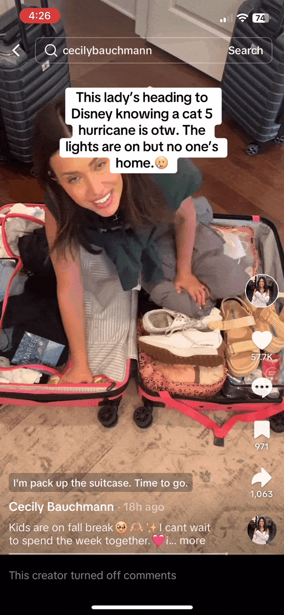 当然,天外有天人外有人,突破天际的“气人”行为,远远不止这一些。在飓风“米尔顿”登陆佛州2天前,美国一网红居然发视频称将坐飞机到佛州迪士尼玩。