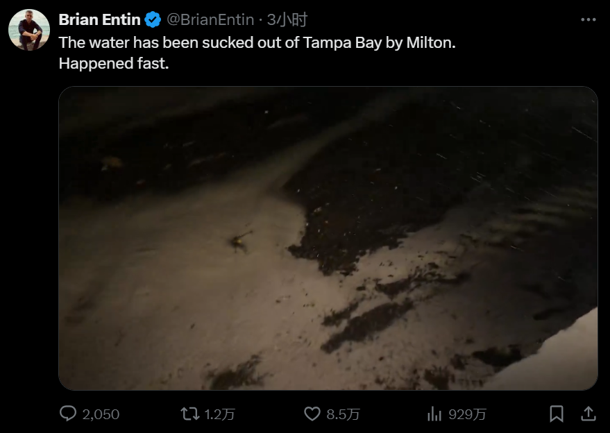 坦帕湾海水迅速被飓风迅速“抽空”,只剩下沙子。
