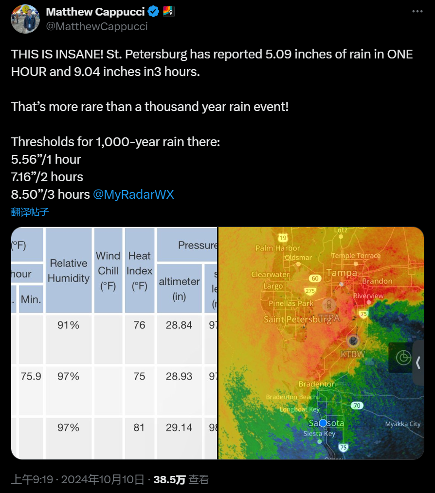 然而,这还不是最恐怖的,与此同时佛州坦帕湾地区降雨量还达到了惊人的 10 至 14 英寸。