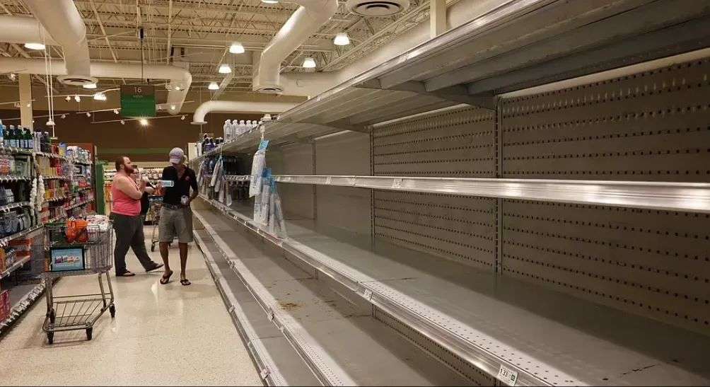 超市的货架上,能抢到的吃的和日用品都被抢光了: