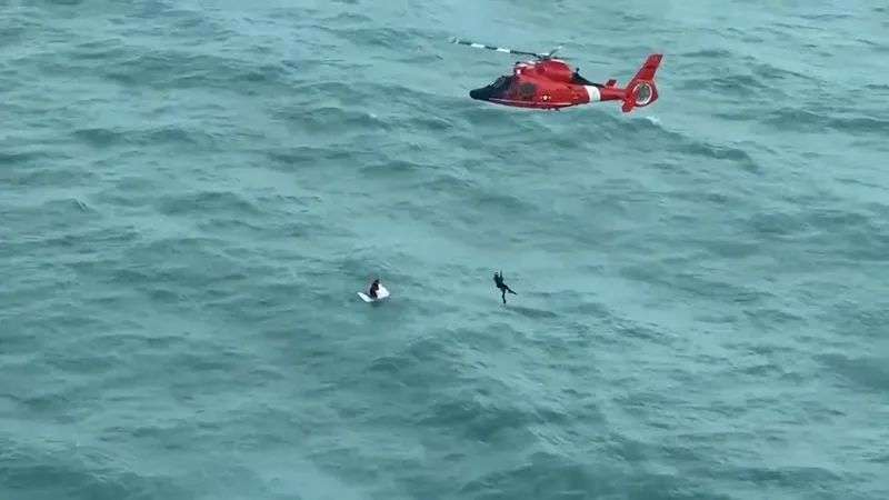 有人的船都沉了,被海浪冲走,等待直升机的救援: