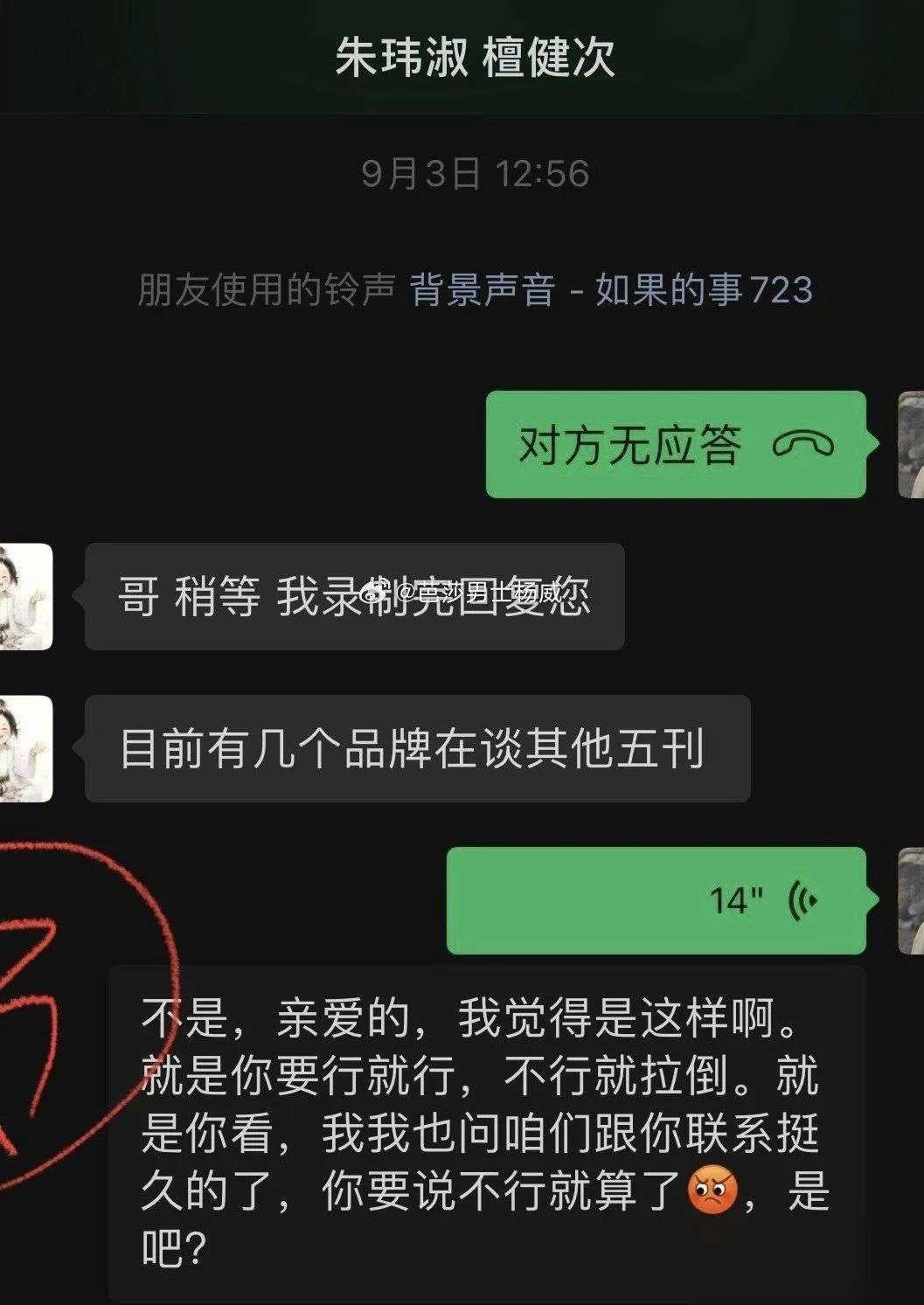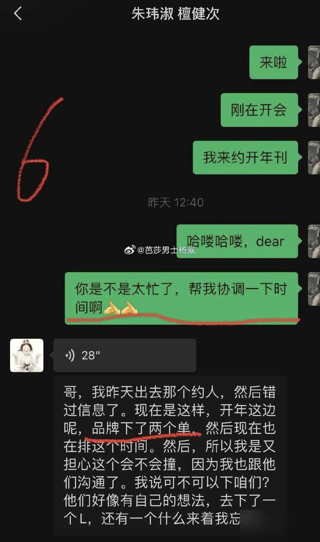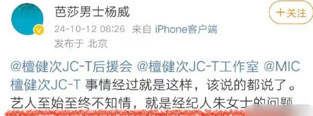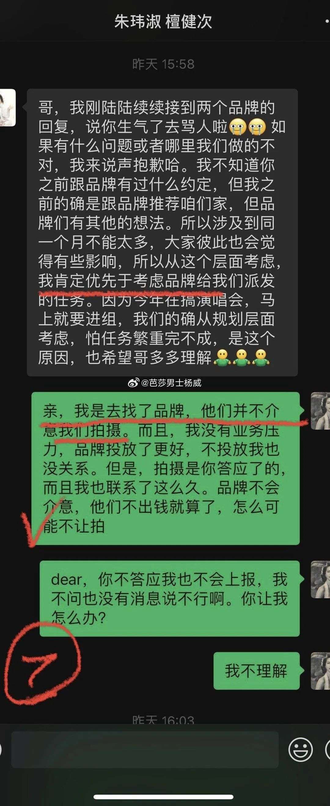 对此,杨威也解释称艺人始终不知情,就是经纪人的问题。后面,杨威看檀健次方始终没有回应,于是陆续放了聊天记录。