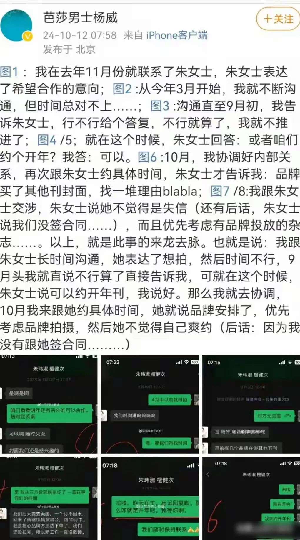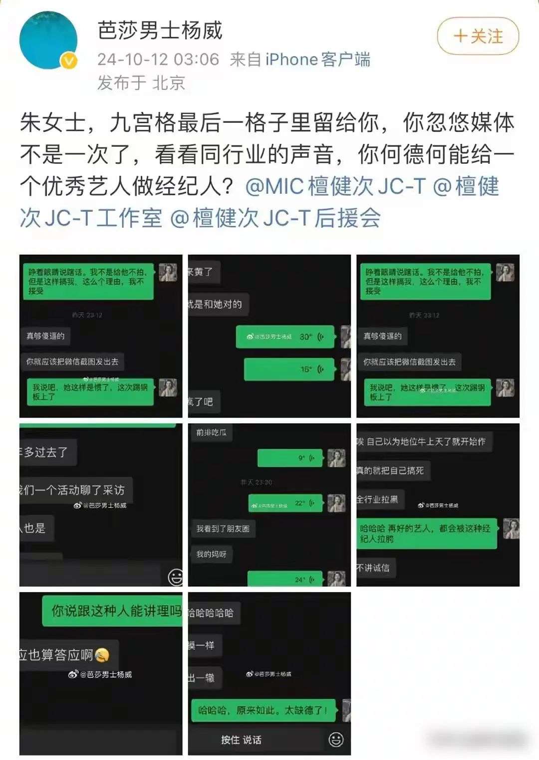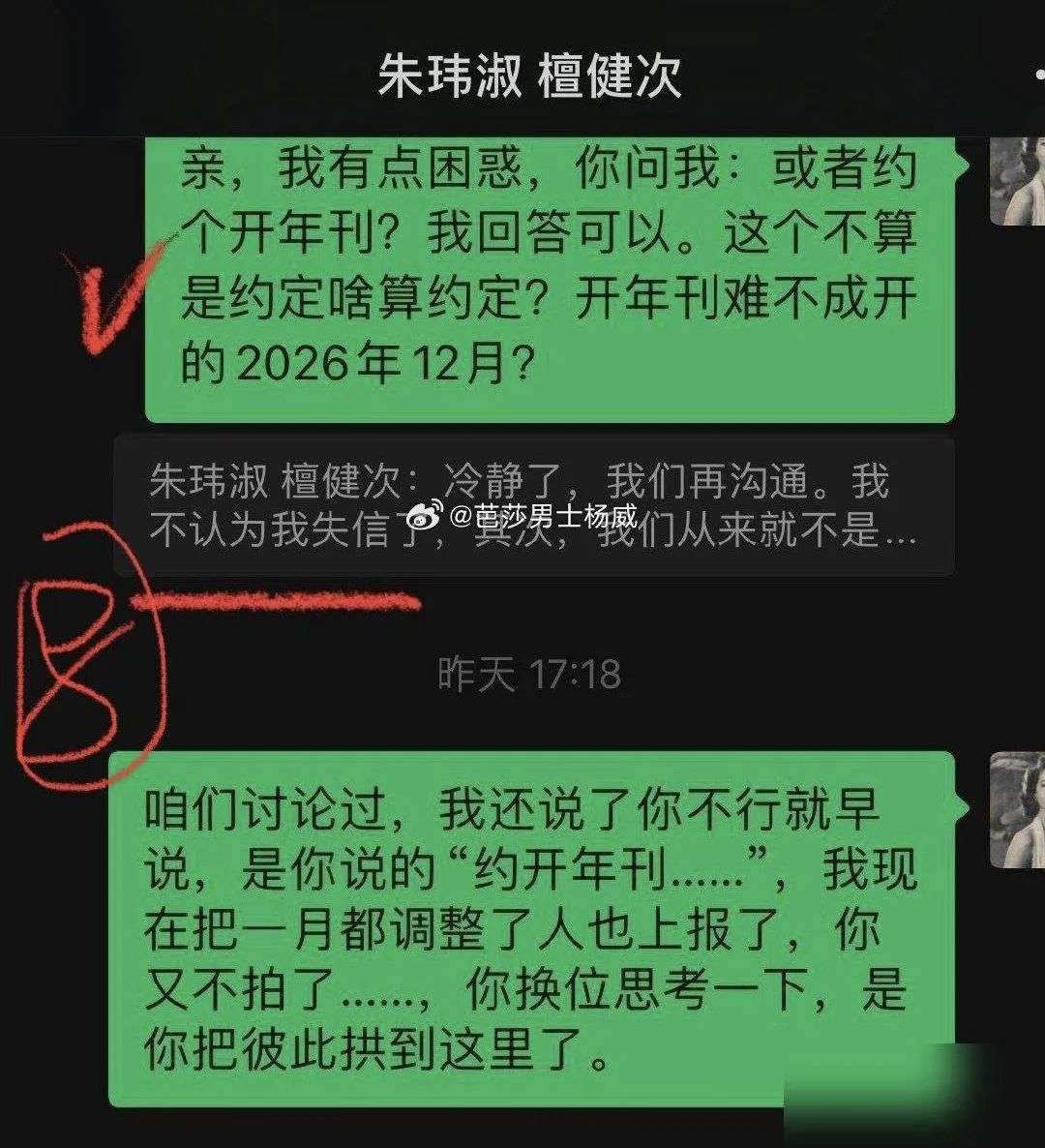 对此,杨威也解释称艺人始终不知情,就是经纪人的问题。后面,杨威看檀健次方始终没有回应,于是陆续放了聊天记录。
