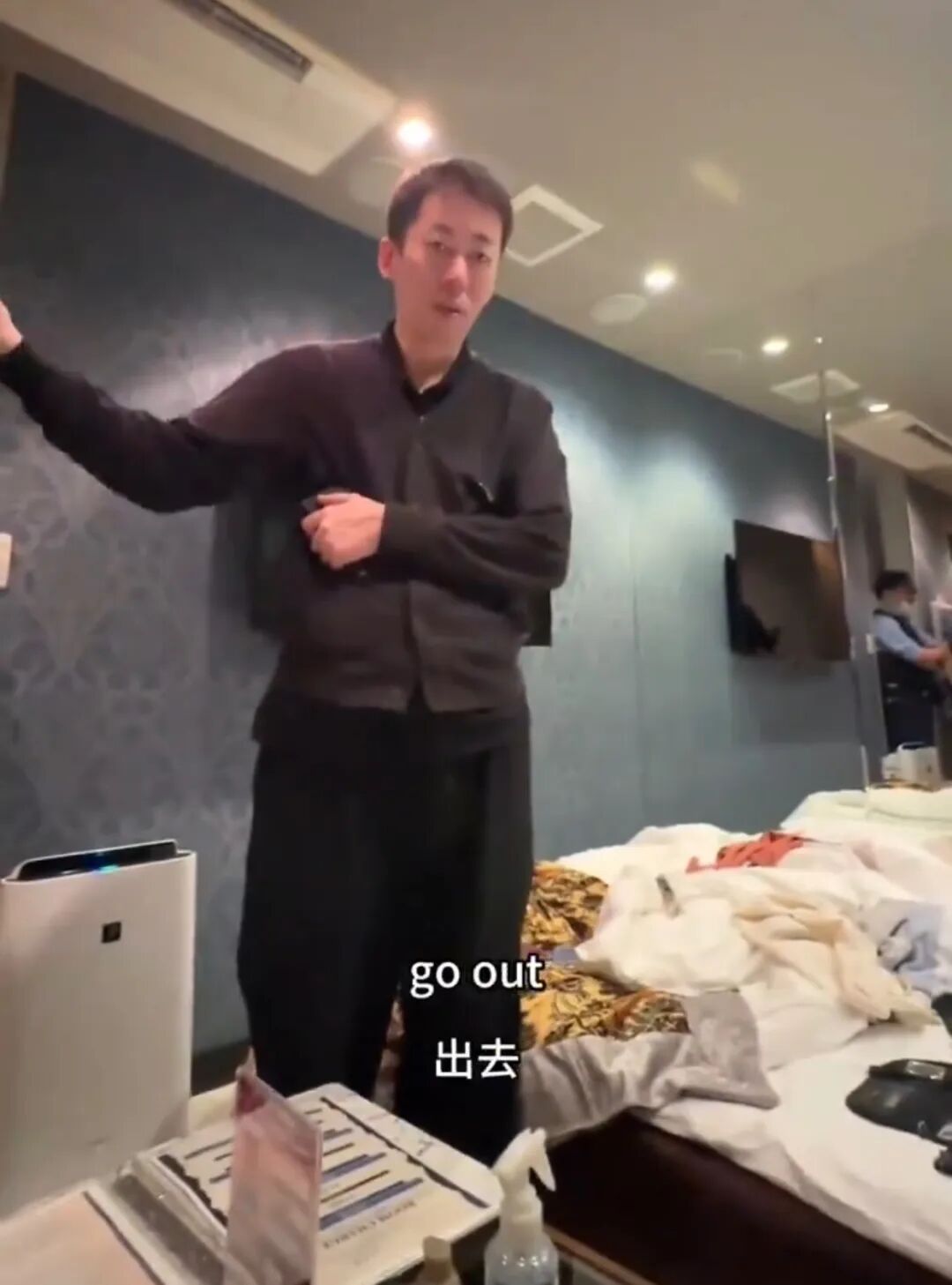 镜头一转,一位穿黑衣的工作人员出现了,他二话不说就对男子下逐客令。
