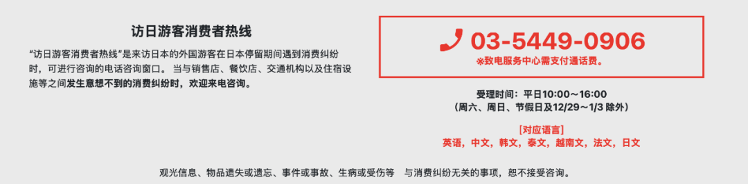 如果被收取高额的取消费用,可以直接拨打图中的“访日游客消费者热线”进行咨询投诉。