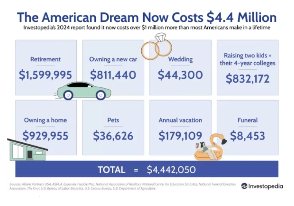 根据美国统计局的数据,一个普通本科毕业生从职场新人到退休,平均能够赚取的财富远不足以支撑这样的梦想。这个梦想,对于大多数人来说,似乎越来越难以触及。