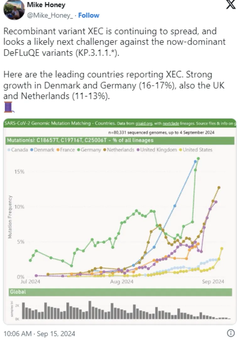 XEC毒株是由两种Omicron亚变种FLiRT和FLuQE合并形成的,具有高度传染性,并且有可能成为全球新的主导毒株。