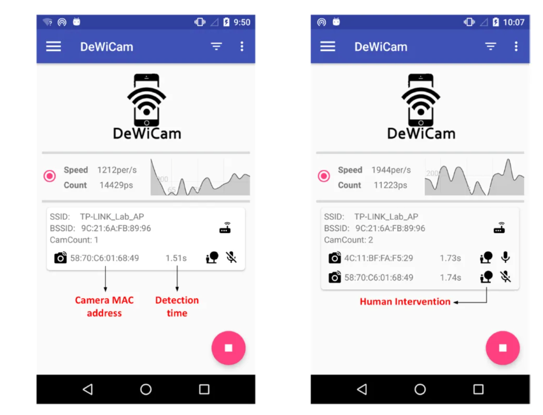 如果是连接到Wi-Fi的偷拍设备,则可以打开手机的Wi-Fi,或者无线网络管理APP,检查在房间Wi-Fi中有没有什么奇怪的设备。浙江大学智能系统安全实验室还曾推出过一款名为DeWiCam的检测APP,能通过捕捉看不见的网络流量模式特征,发现隐藏摄像头的存在。