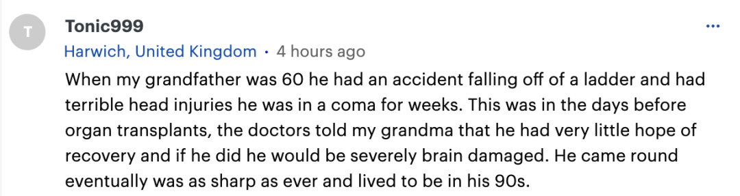 “我爷爷60岁的时候,从梯子上摔下来,头部严重受伤,昏迷了数周。当时还没有器官移植,医生告诉我奶奶,他几乎没有康复的希望,即使康复了,脑部也会受到严重损伤。他最终恢复了意识,和以前一样敏锐,活到了90多岁。”