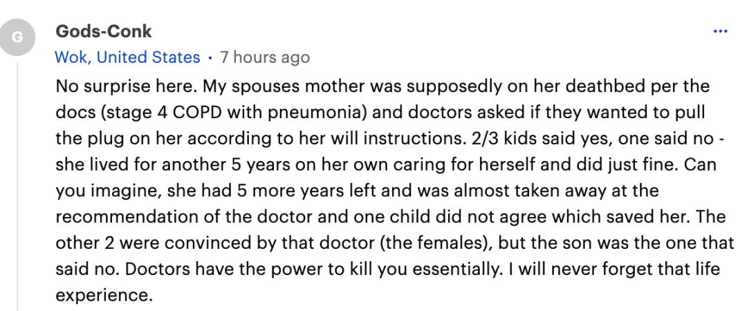 “这并不奇怪。根据医生的说法,我配偶的母亲已经奄奄一息(患有肺炎的4期COPD),医生询问他们是否要根据她的遗嘱指示为她断绝生命。三个孩子中的两个同意,一个拒绝——她自理的情况下又活了5年,情况很好。你能想象吗,她还剩下5年的生命,却差点在医生的建议下当即被夺走生命,一个孩子不同意,救了她。其他两个女儿被那位医生说服了,但儿子说不。医生本质上有权杀死你。我永远不会忘记那段人生经历。”