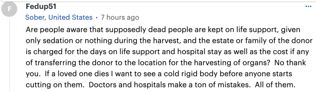 “人们是否知道,据说已经死去的人在器官摘取过程中会使用生命支持系统,只注射镇静剂或不注射任何药物,捐献者的遗产或家人需要支付生命支持系统和住院天数的费用,以及将捐献者转移到器官摘取地点的费用(如果有的话)?不,谢谢。如果亲人去世,我希望在有人开始切开他们之前看到一具冰冷僵硬的尸体。医生和医院会犯很多错误。”