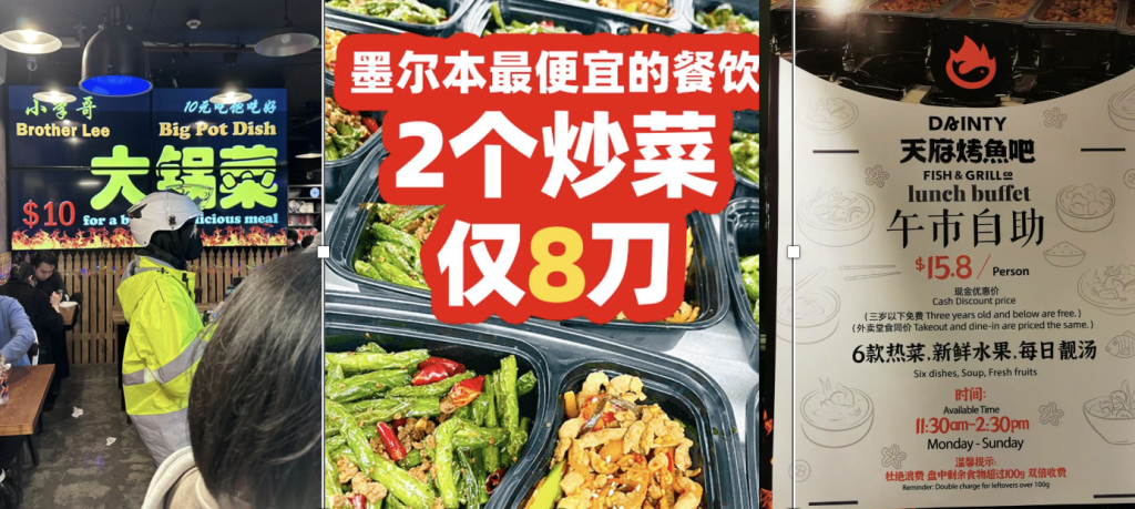 在市中心和Glen Waverley等地,中餐馆各类低价信息层出不穷,有“9.9澳元管饱”的菜饭、10多澳元的午餐自助,还有墨尔本超市推出的“8澳元两个炒菜”的超低价。