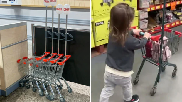 原来,Coles 在 Surry Hills Village 分店推出了“迷你手推车”,专为儿童设计,供他们在店内推行,让他们“帮忙”购物。