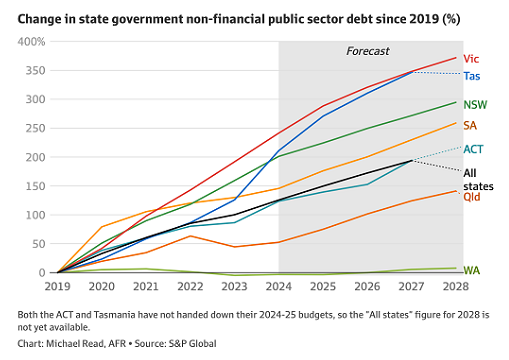 预计维多利亚州的债务增长将尤为显著,尽管其经济规模不及新南威尔士州,但其债务水平预计将迅速攀升,最终超越新南威尔士州,成为澳大利亚负债最高的州。