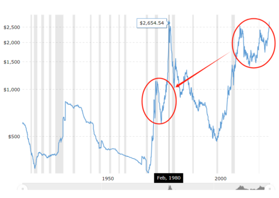 从上图可见,黄金经CPI调整后的实际购买力已经来到了1980年大通胀时的顶峰。