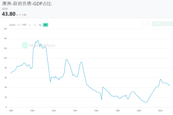 但是如果将整个周期拉长来看,其实与历史相比,澳洲的债务水平,其实仍在一个相对较低的位置。